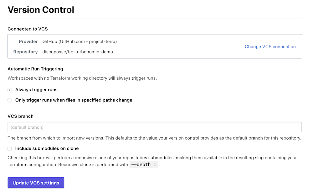 I’ve setup this workspace to a specific VCS configuration and I want every change that occurs in the configuration to trigger a new plan. There are options to only watch a specific file but my use-case is specific that I am looking for lots of potential configuration changes so I’m just monitoring the entire folder.